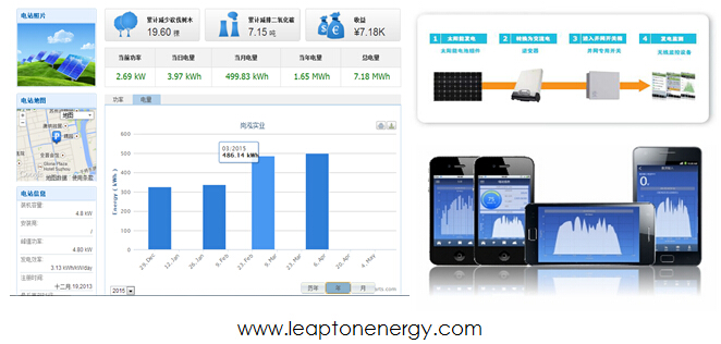 采用第三方監(jiān)控系統(tǒng)實(shí)現(xiàn)整個(gè)光伏系統(tǒng)的監(jiān)控和展示。用戶(hù)可在電腦和移動(dòng)設(shè)備上進(jìn)行發(fā)電系統(tǒng)查看。