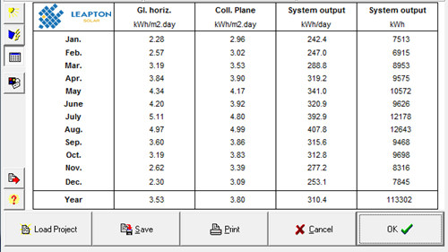 支架25度傾角情況下,裝機(jī)容量為97.24KW,用PV-SYST模擬發(fā)電量可知年發(fā)電量約為113301度電。各月發(fā)電情況如下: