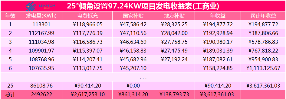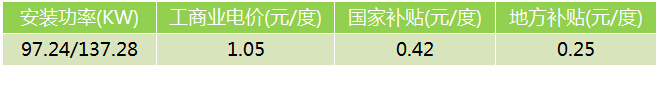 系統(tǒng)25度傾角設(shè)置時(shí),采用鍍鋅鋼支架,系統(tǒng)安裝組件374塊,配置30KW逆變器3臺(tái),并網(wǎng)接入柜1臺(tái),安裝容量為97.24KW。市場(chǎng)單價(jià)約為8.2元/W,項(xiàng)目總價(jià)約為79.74萬(wàn)元。