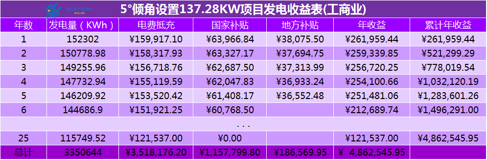 通過(guò)以上分析對(duì)比可知,針對(duì)此屋頂,系統(tǒng)5度設(shè)置比系統(tǒng)25度設(shè)置系統(tǒng)單價(jià)便宜0.47元/W。也就是說(shuō),采用MRA3A2平屋頂簡(jiǎn)易型支架的5度傾角系統(tǒng),項(xiàng)目單價(jià)為7.73元/W,項(xiàng)目總價(jià)為106.117萬(wàn)元。