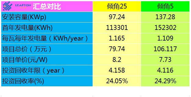 對(duì)比可知,系統(tǒng)25度設(shè)置時(shí)平均每瓦年發(fā)電量為1.16517度;系統(tǒng)5度設(shè)置時(shí)系統(tǒng)平均每瓦年發(fā)電量為1.10943度。