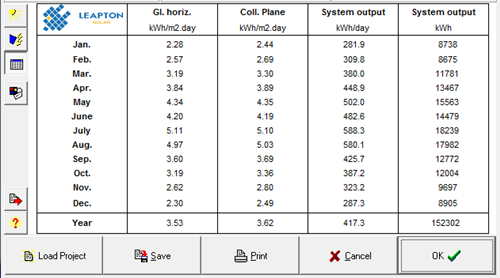 支架5度傾角情況下,裝機(jī)容量為137.28KW。用PV-SYST模擬發(fā)電量可知年發(fā)電量約為152302度電。各月發(fā)電情況如下: