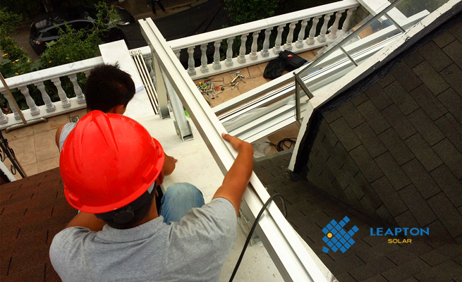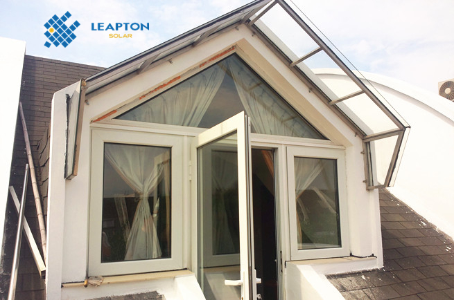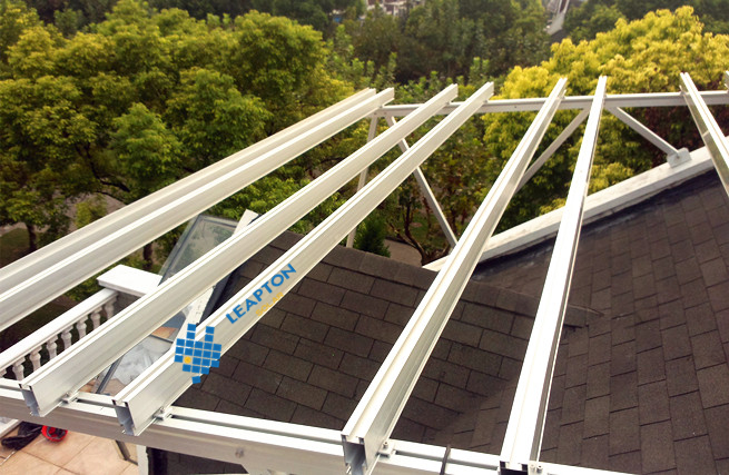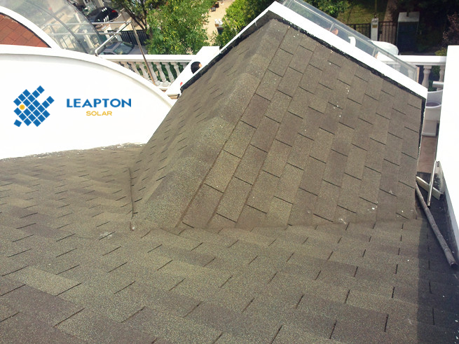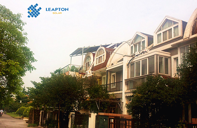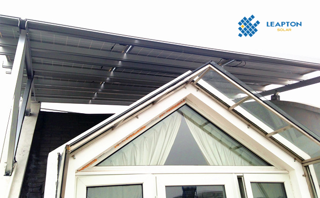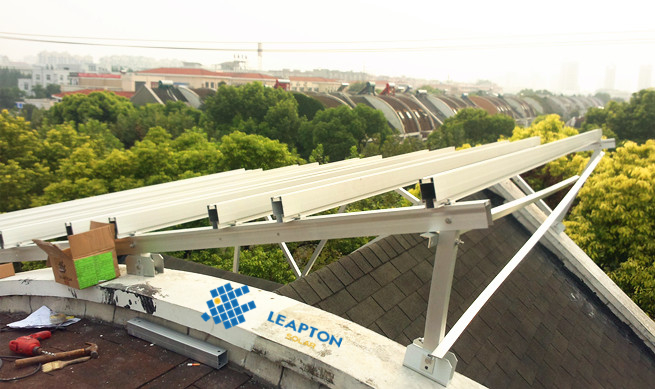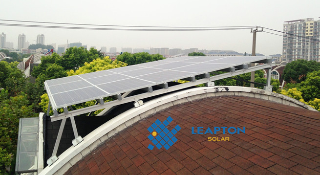屋頂情況:連棟別墅,混凝土斜屋頂。采用固定式支架,支架通過膨脹螺栓固定安裝在女兒墻上,支架傾角20度。安裝250W多晶組件15塊, 安裝功率3.75KW。